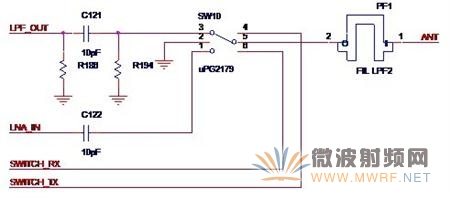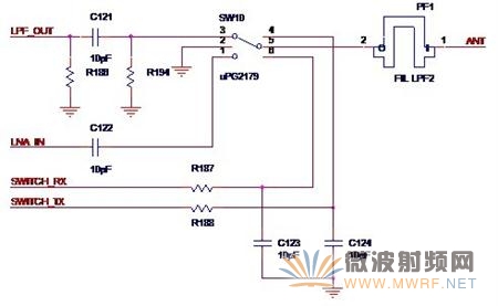 如圖5-3所示,就是Atheros的典型發(fā)射與接收回路SW10就是那顆切換芯片。LPF_OUT是來自功率放大器的輸出信號,R186,C121與R194組成了Π型匹配網(wǎng)絡,LNA_IN是送至低噪聲放大器的信號,SWITCH_TX與SWICTH_RX這兩個信號的組合就控制著是打開發(fā)射通路還是打開接收通路。