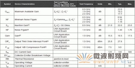 微波器件(晶體管或芯片)的參數(shù),基本上就決定了低噪聲放大器的性能,我們來看一下最常用的SGA-8343的參數(shù),如圖4-2所示。圖中給出的參數(shù)包括最大增益,噪聲系數(shù),S21,工作頻率,供電電壓,消耗的電流等等。對于專用的低噪聲放大器芯片,參數(shù)也基本如此,在這里我們就不詳細說了。