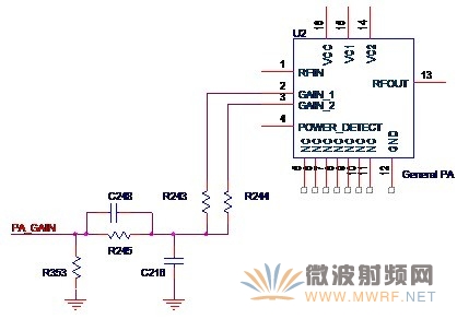 增益控制的作用就是可以改變功放電路的增益,從而能改變輸出功率。改變功率放大器最終輸出功率的方法有兩種,一種是無線收發(fā)器改變自身的輸出功率,另外一種就是改變功放電路的增益,在這里我們主要關注后者。通常功放芯片的增益控制管腳會有兩個或者兩個以上,分別改變的是第一級放大和第二級放大的增益值,圖3-11是典型的增益控制原理圖。來自收發(fā)器的控制信號PA_GAIN經(jīng)過R245和C248組成的RC濾波電路(濾除來自收發(fā)器的可能的交流成分)通過兩個電阻作用于功放芯片的GAIN_1和GAIN_2兩個管腳,從而控制功率放大電路的增益,也控制著最終的輸出功率。