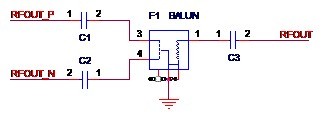 方法一,使用平衡器。原本相位相差180°的差分信號經(jīng)過平衡器(Balun,俗稱巴倫),就可以得到合二為一的單端射頻信號。如圖2-5所示,圖中的F1就是一個平衡器,差分信號RFOUT_P和RFOUT_N經(jīng)過F1得到單端信號RF_OUT。