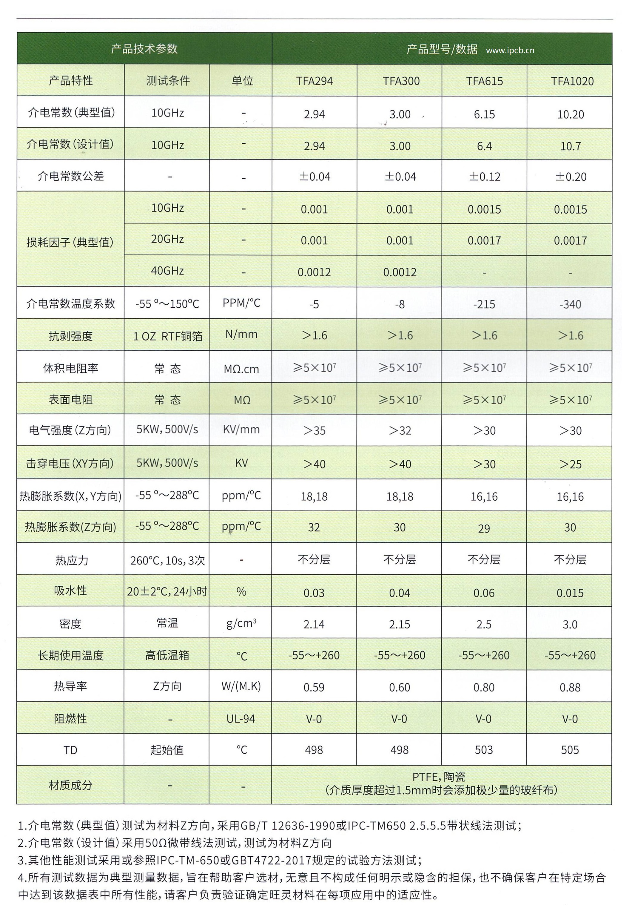 該系列的介電常數(shù)為2.94、3.0、6.15、10.2。TFA系列的標(biāo)準(zhǔn)與RTF低粗精銅箔,減少導(dǎo)體損失,同時(shí)提供優(yōu)良的剝離強(qiáng)度